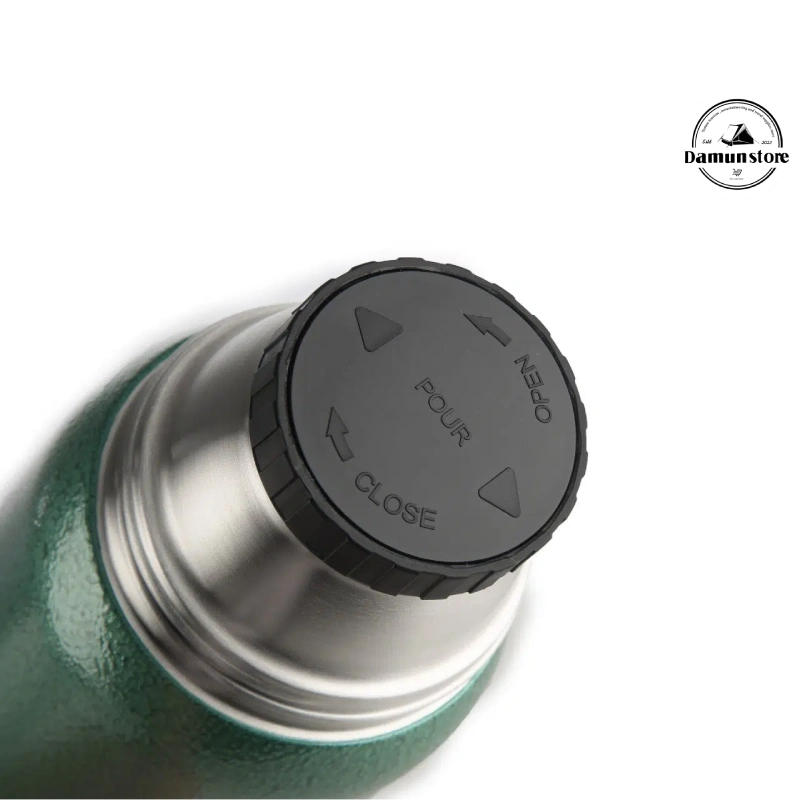 یکی از نکات کاربردی در طراحی این مدل، درب دو جداره استیل ضد زنگ است که با یک درپوش یکلمسی، ریختن مایعات را آسان و بدون ریزش میکند. این مکانیزم بهخصوص در زمان استفاده در سفر بسیار کارآمد است و به شما کمک میکند بدون باز و بستهکردن پیچیده، نوشیدنی خود را بهراحتی سرو کنید.