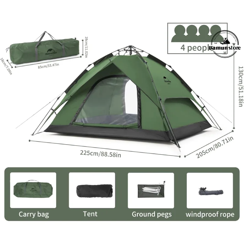 چادر اتومات نیچرهایک مدل NH21ZP008 یک گزینه حرفهای برای کسانی است که به کمپینگ، کوهنوردی، سفرهای آفرود و طبیعتگردی خانوادگی علاقهمند هستند. این چادر چهار نفره با طراحی هوشمندانه و متریال مقاوم، به شما این امکان را میدهد که در هر شرایط آبوهوایی سرپناهی ایمن و راحت داشته باشید.