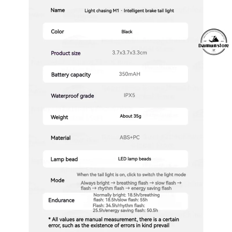 این چراغ تنها ۳۵ گرم وزن دارد و با ابعاد کوچک ۳.۷ × ۳.۷ × ۳.۳ سانتیمتر، هیچ مزاحمتی برای حرکت یا ظاهر دوچرخه ایجاد نمیکند. بدنه آن از ABS و PC مقاوم ساخته شده که علاوه بر سبکی، در برابر ضربه و خطوخش مقاومت بالایی دارد. همین ویژگی باعث میشود بتوانید در شرایط سخت مانند آفرود، طبیعتگردی یا مسیرهای کوهستانی با خیال راحت از آن استفاده کنید.